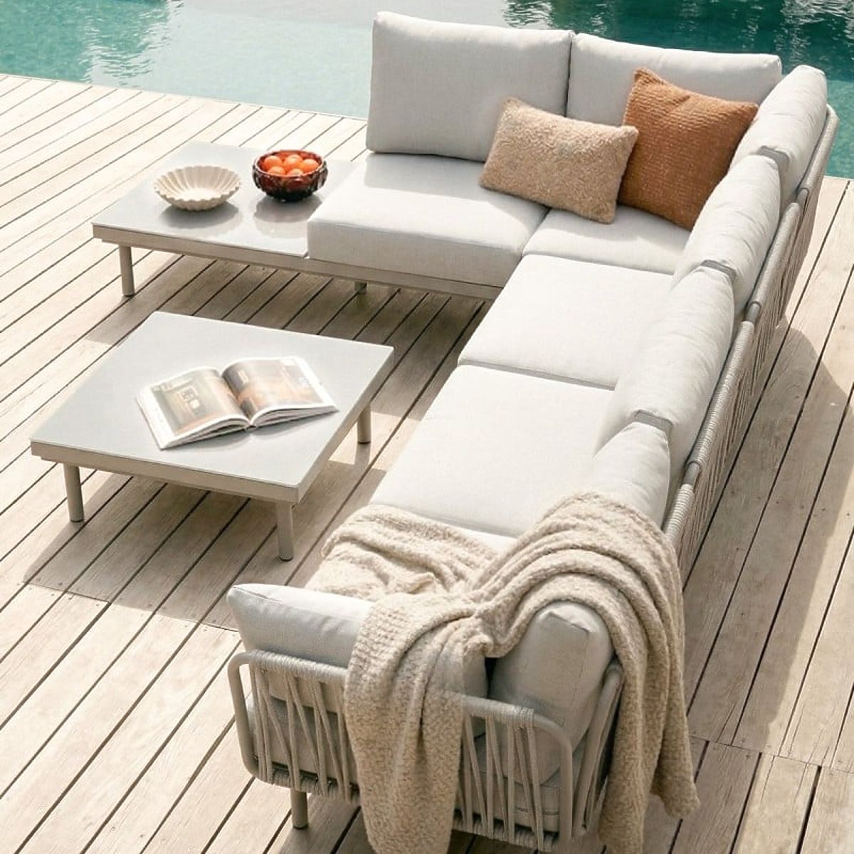 Rohová sedačka Amarello – jemná elegancia v harmonickej forme. Hliníková konštrukcia v béžovošedom odtieni, odolné pletenie a pohodlné vankúše vytvárajú sofistikovaný priestor na oddych, doplnený praktickým stolíkom a bočnou poličkou.