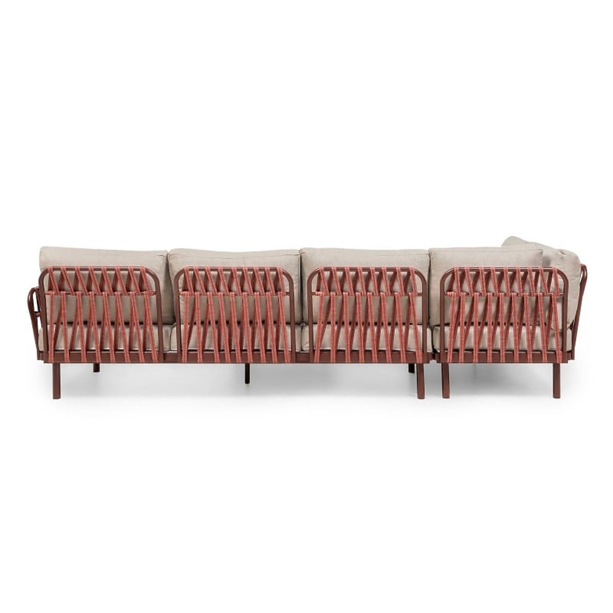 Rohová sedačka Amarello – jemná elegancia v harmonickej forme. Hliníková konštrukcia v červenohnedom odtieni, odolný výplet a pohodlné vankúše vytvárajú sofistikovaný priestor na oddych, doplnený praktickým stolíkom a bočnou poličkou.