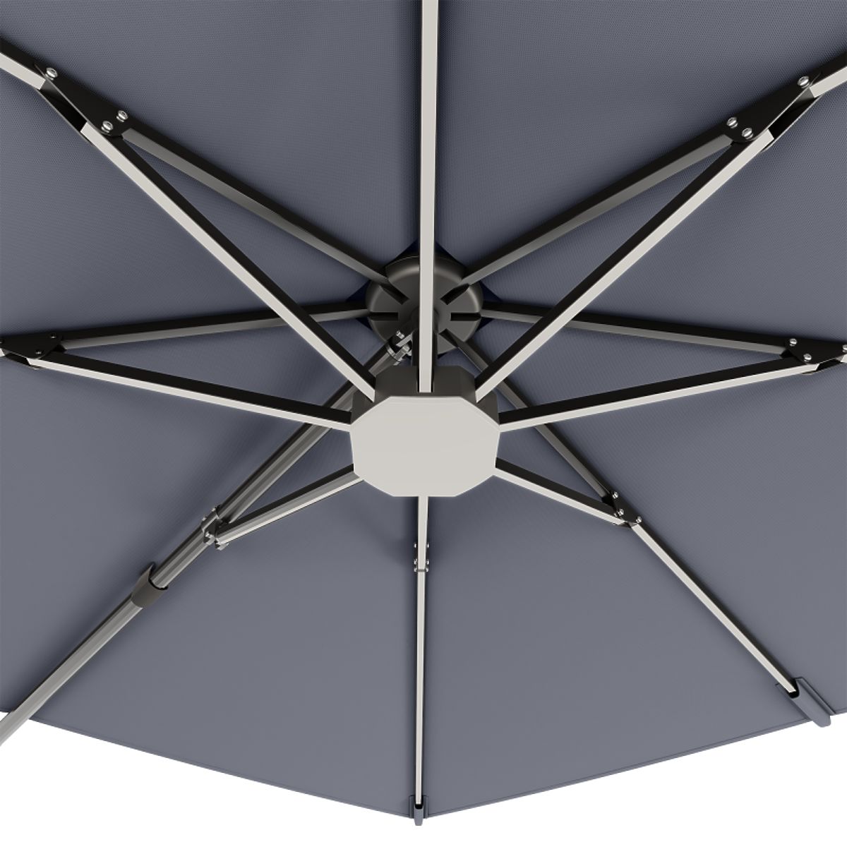Slnečník Shade Deluxe vám poskytuje plnú kontrolu nad relaxáciou – otočenie o 360° a nastavenie uhla sklonu zabezpečujú tieň presne tam, kde ho potrebujete. Solárne LED osvetlenie umožňuje užívať si večerný odpočinok v príjemnom svetle, zatiaľ čo pevná konštrukcia a odolný poťah zaručujú komfort a trvanlivosť na mnoho rokov.