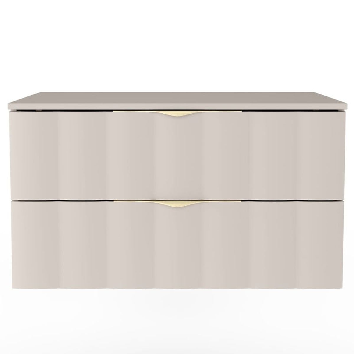Povýšte štandard vašej kúpeľne s kašmírovou skrinkou Omi s elegantným dizajnom a vlnitým čelným panelom. Dve priestranné zásuvky s tichým zatváraním a úchyty v farbe kartáčovaného zlata zabezpečia dokonalú organizáciu.