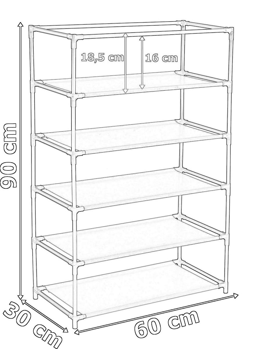 Polička, regál na topánky vyrobený z oceľových rámov tvoriacich jej kostru. Na rám je nasadený priedušný materiál dobrej kvality. Je ľahká na údržbu a praktická, polička je ideálna na ukladanie čiapok, šálov, rukavíc, topánok alebo iných drobných vecí. Ľahká a pevná konštrukcia, ktorú môžete kedykoľvek zložiť, premiestniť alebo prestaviť.