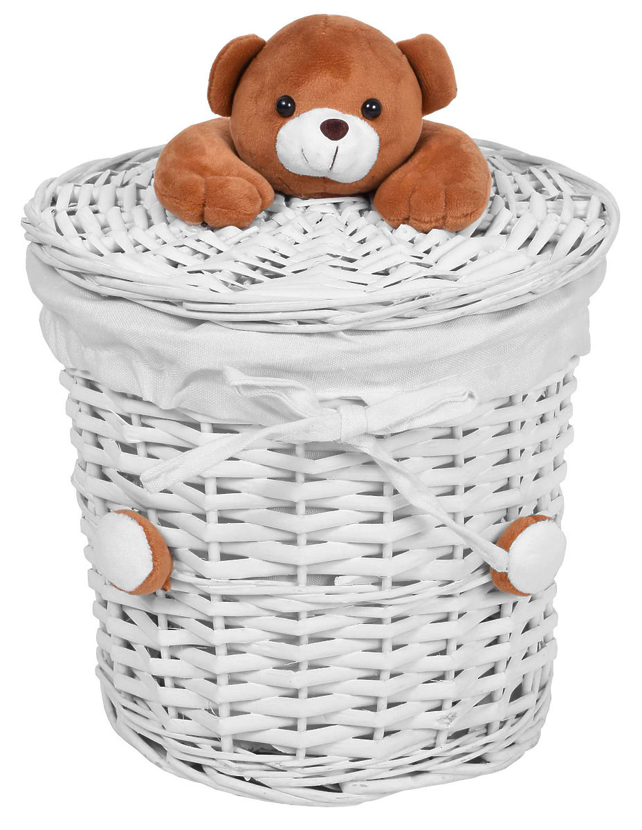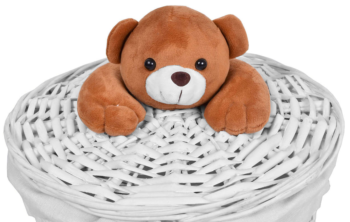 Produkt je vyrobený z prútia s rovnomerným pletením, vnútri je vystlaný odolným, krémovým, ľanovým materiálom. Veko má navrchu príjemného na dotyk, plyšového medvedíka.